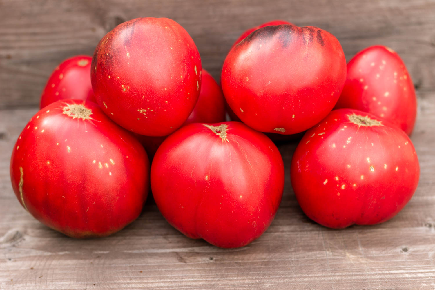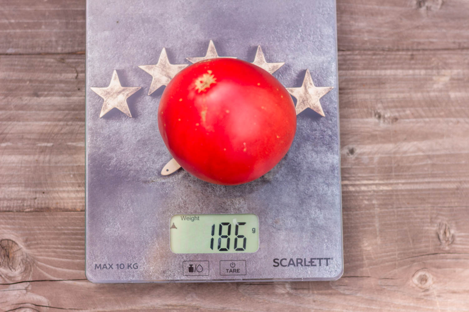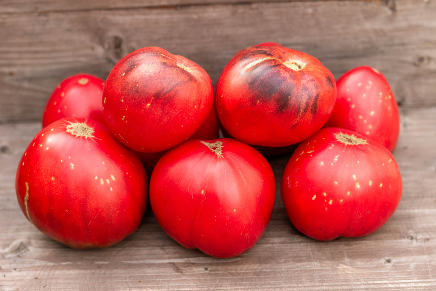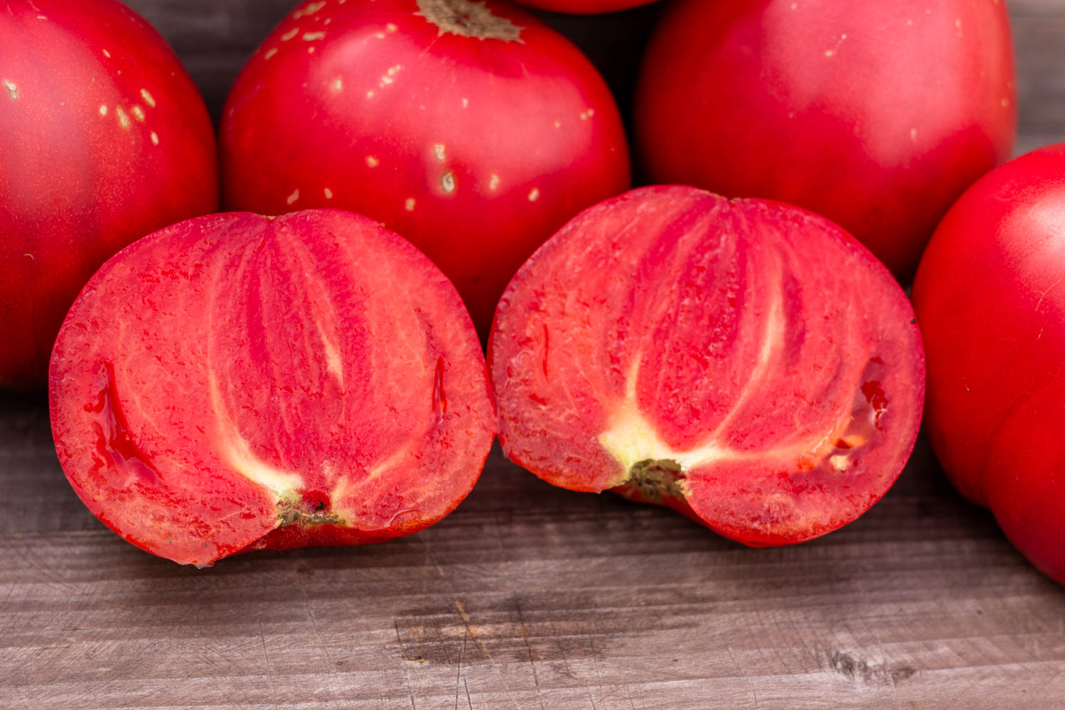 Высокорослый до 1,8 метра, среднеспелый. Плоды округло-седцевидной формы, темно-малинового цвета с легким напылением антоциана, массой 200гр. Очень мясистый помидор с малым количеством семян.