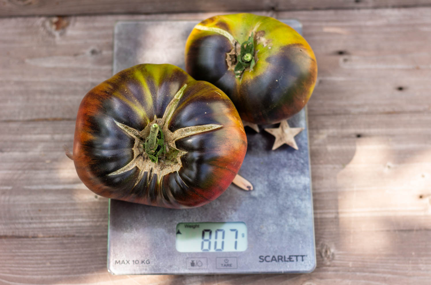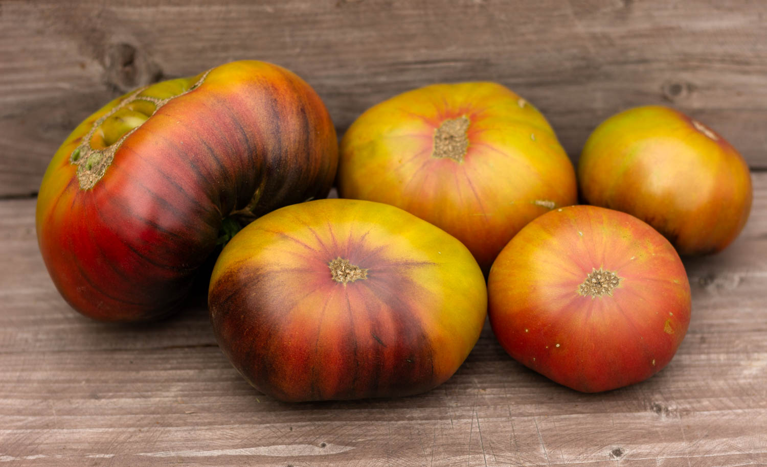 Высокорослый до 2 метров, среднеспелый. Плоды плоскоокруглой формы, с пышными плечами и складками, оливкового цвета с бордовыми полосами и разводами, с хорошей долей антоциана. Масса 200-600гр.