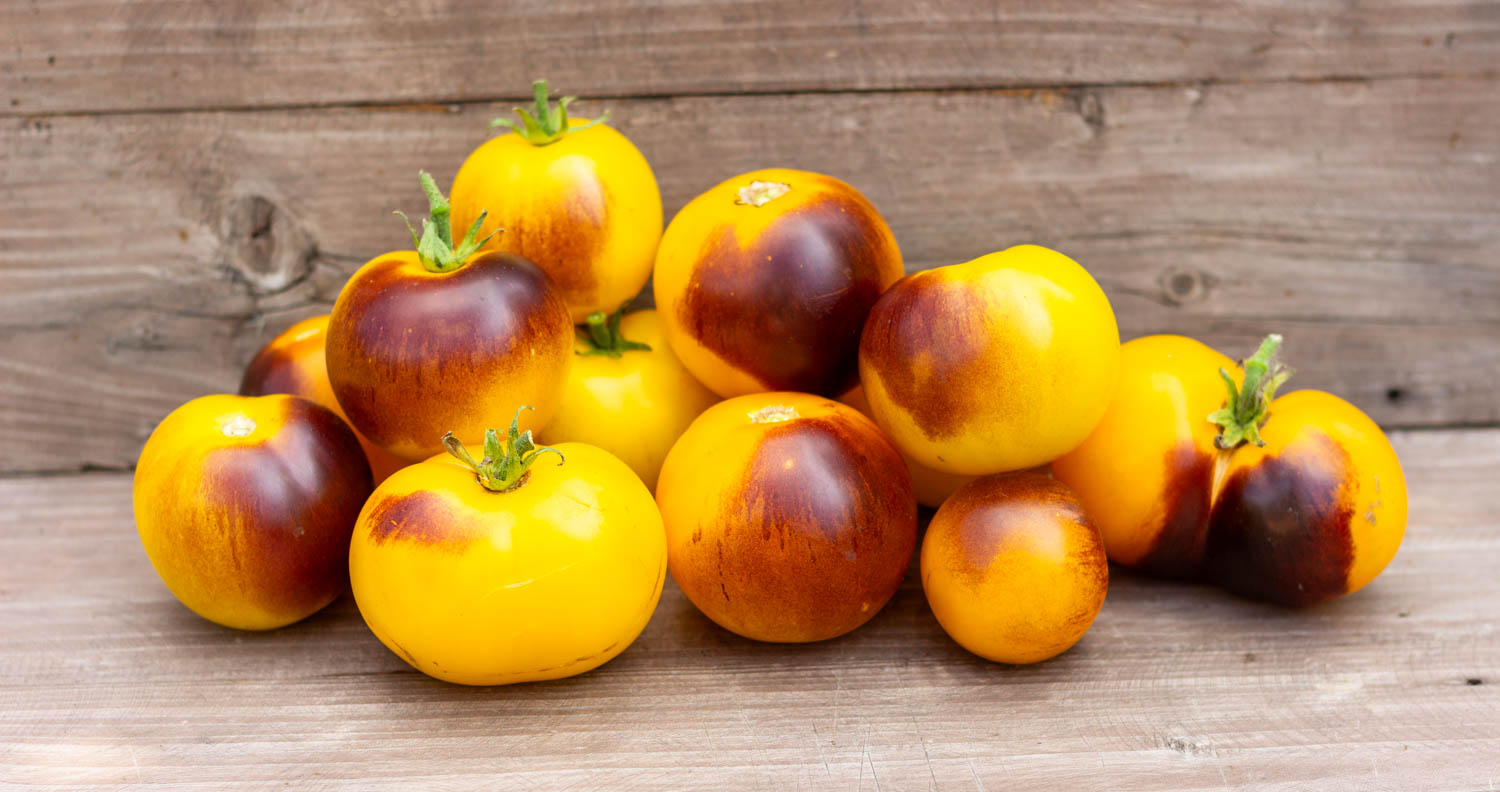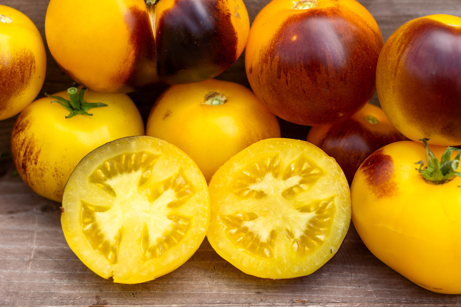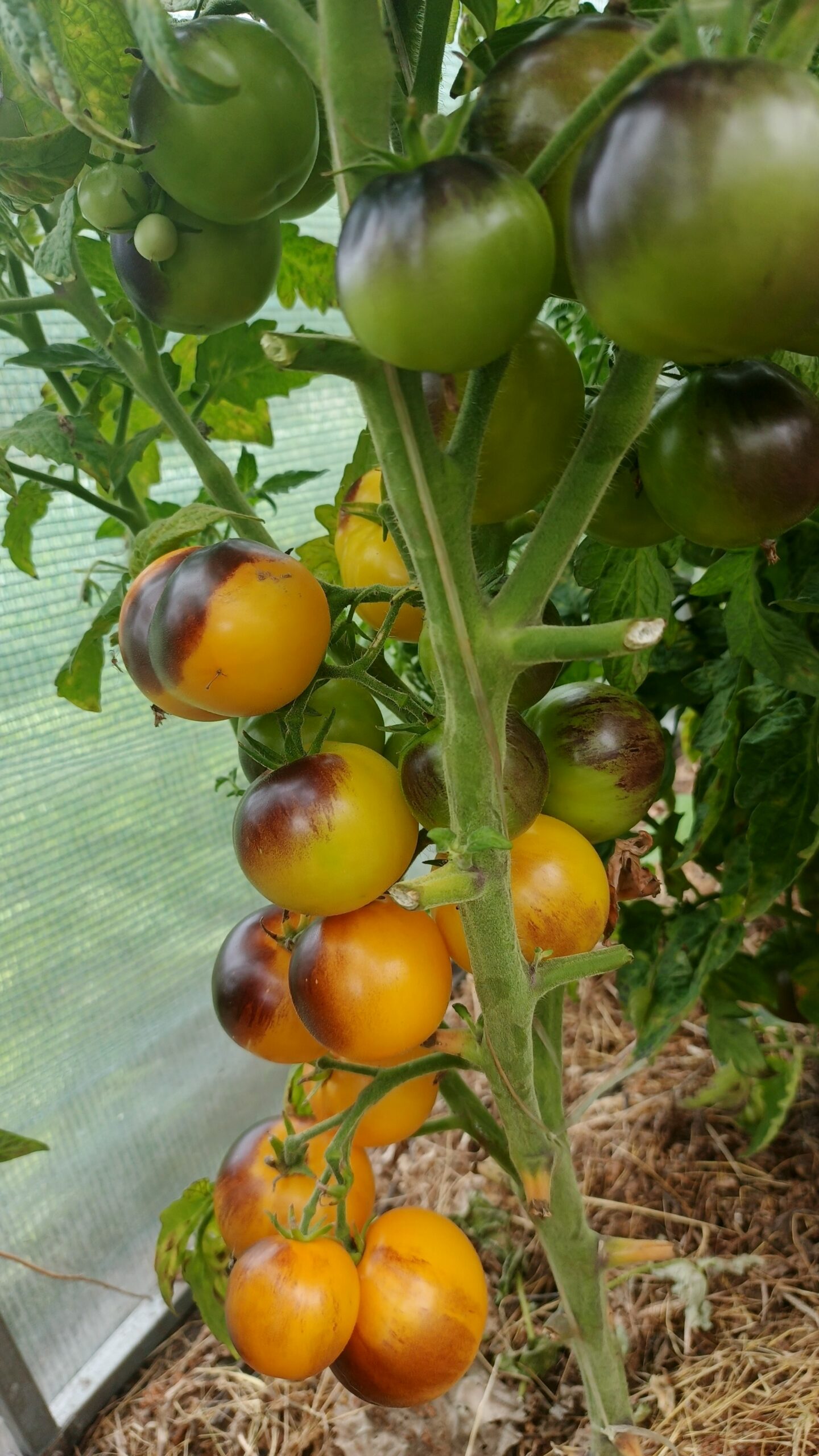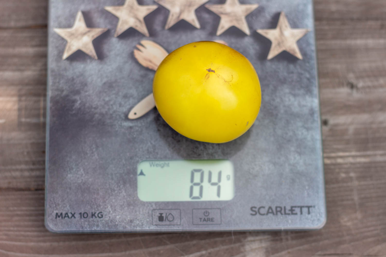 Томатный гном высотой 1м, среднеспелый. Плоды округлые, кремово-желтого цвета, с антоцианом, как бы светятся изнутри, массой 50-80гр. Вкус освежающий, фруктовый.