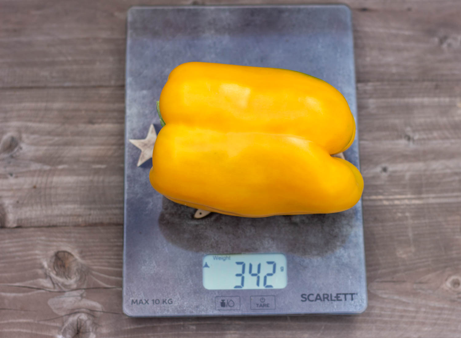 Среднерослый крепкий куст до 70см. Среднеспелый. Плоды очень крупные, кубовидной формы, глянцевые, желтого цвета, массой 200-300гр. Толщина стенки 8-10мм.