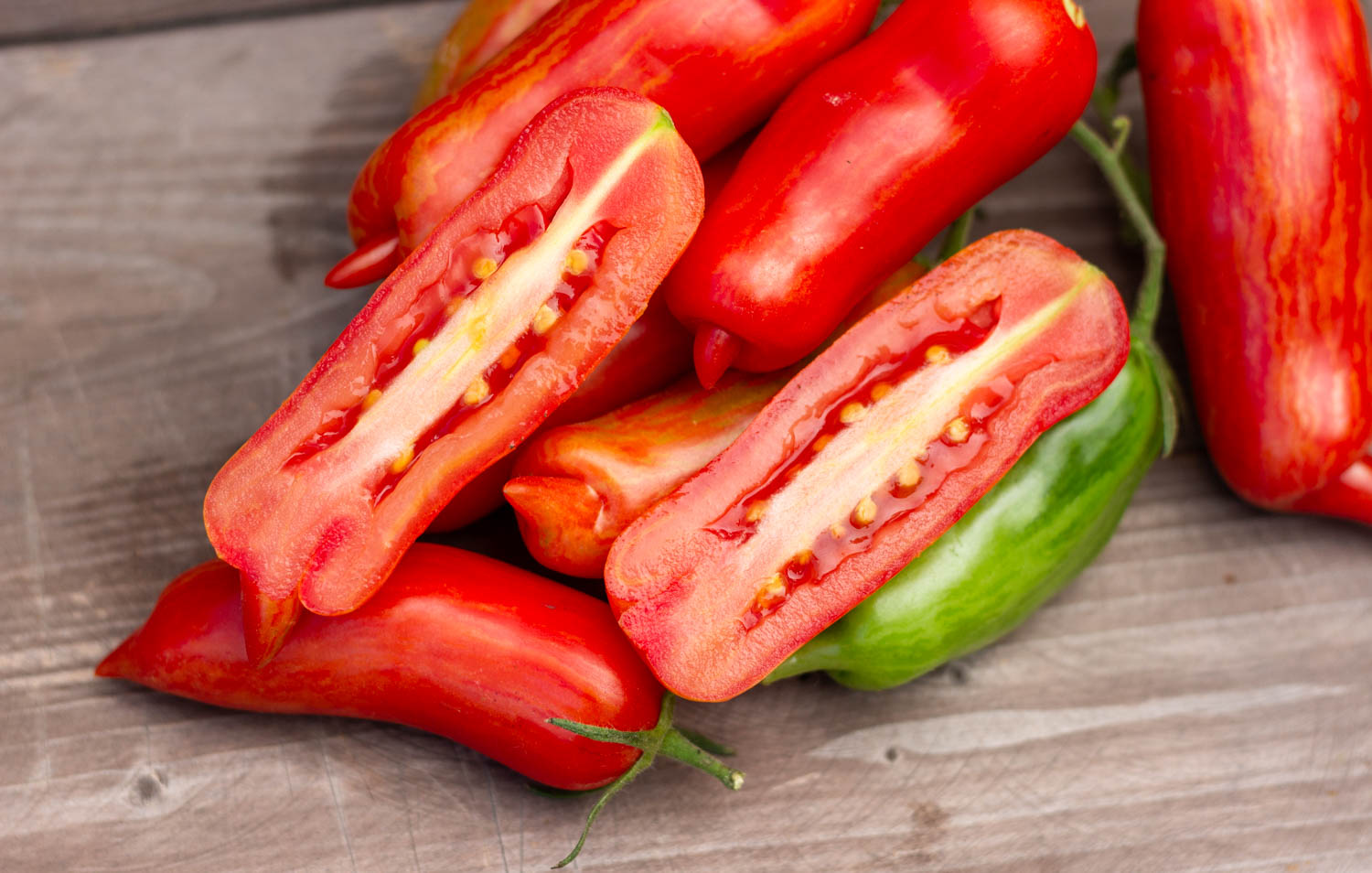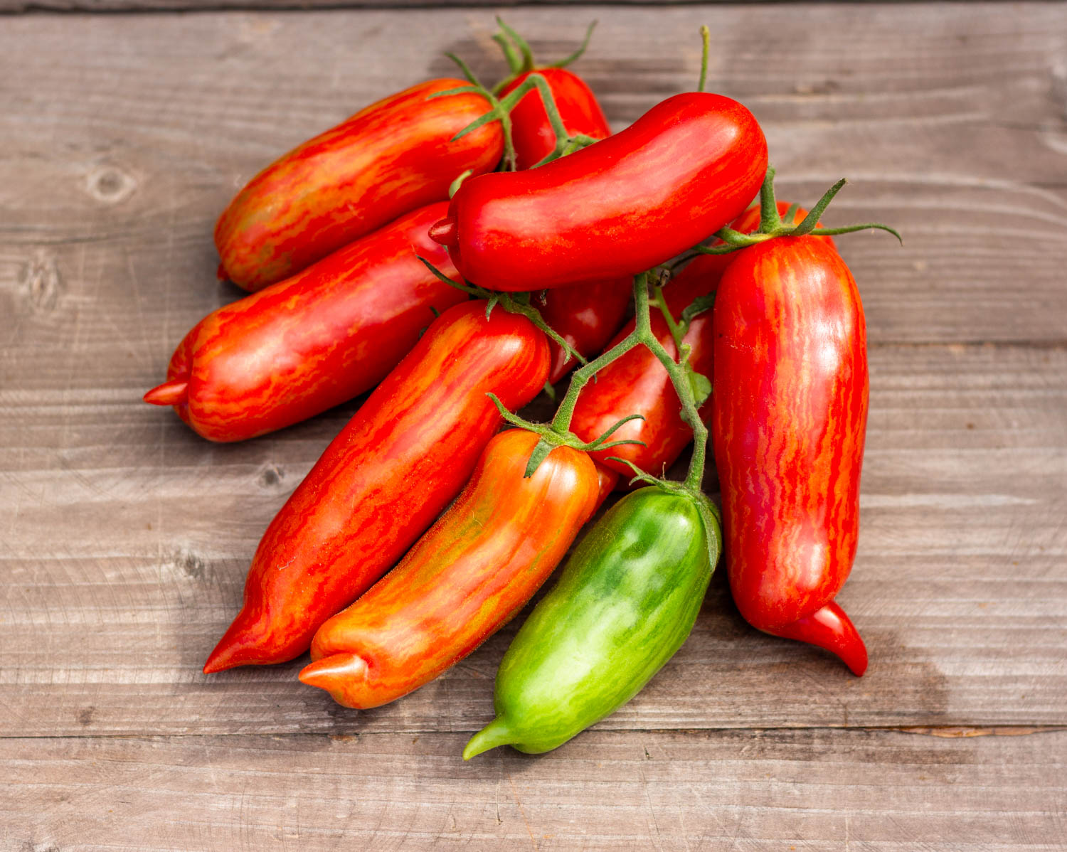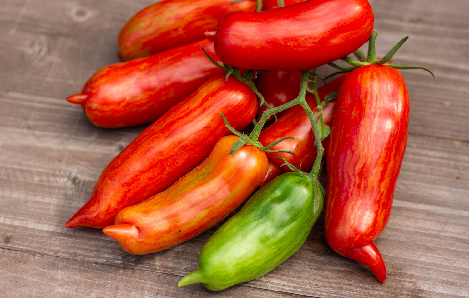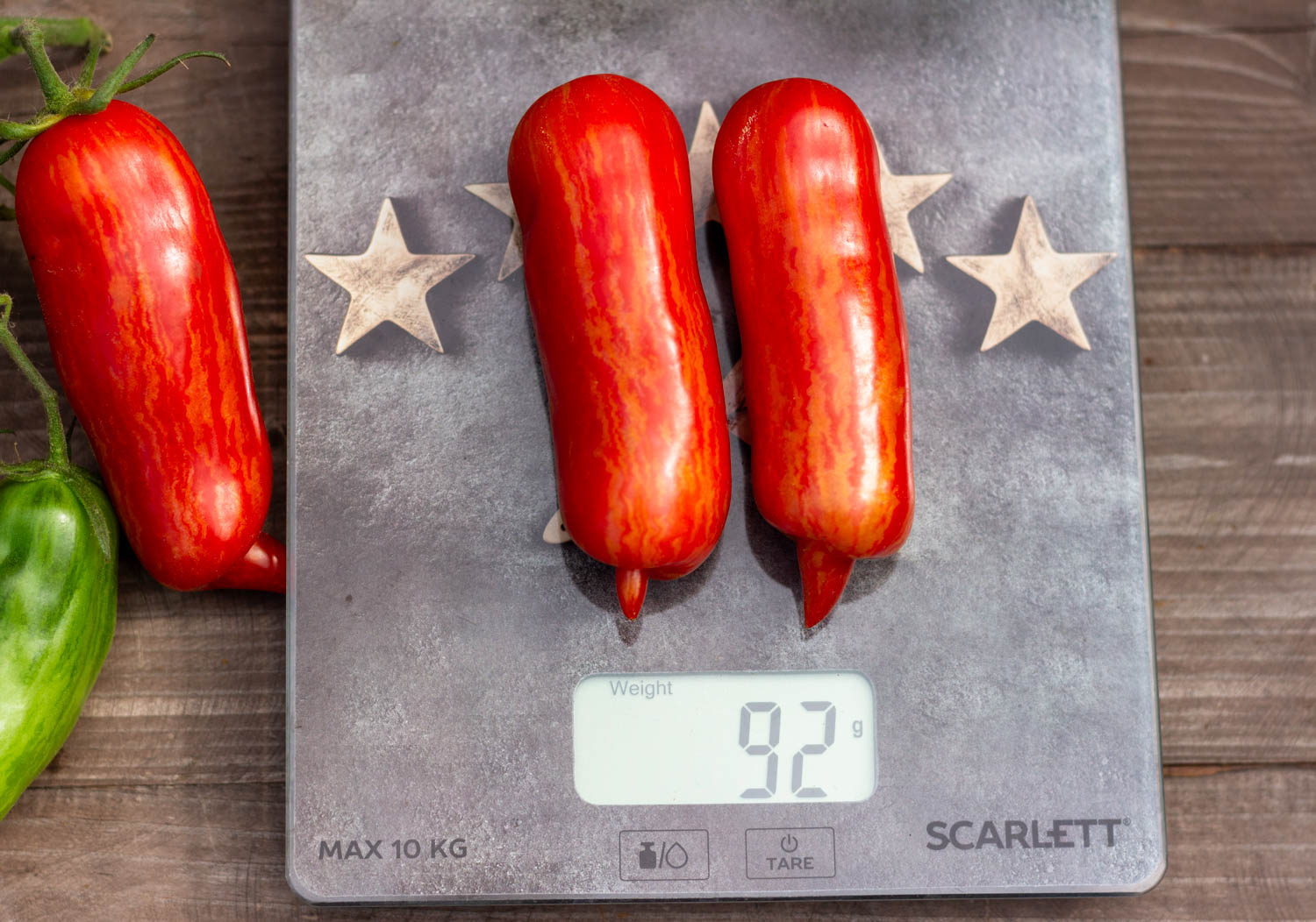 Высокорослый томат более 2 метров, среднеспелый. Плоды пальчиковой формы с клювиков, красного цвета с желтыми полосками, массой 50гр. Мякоть плотная, с малым количеством сока. Вкус насыщенный, томатный, со сладостью. Кисть компактная с 5-7 плодами.
