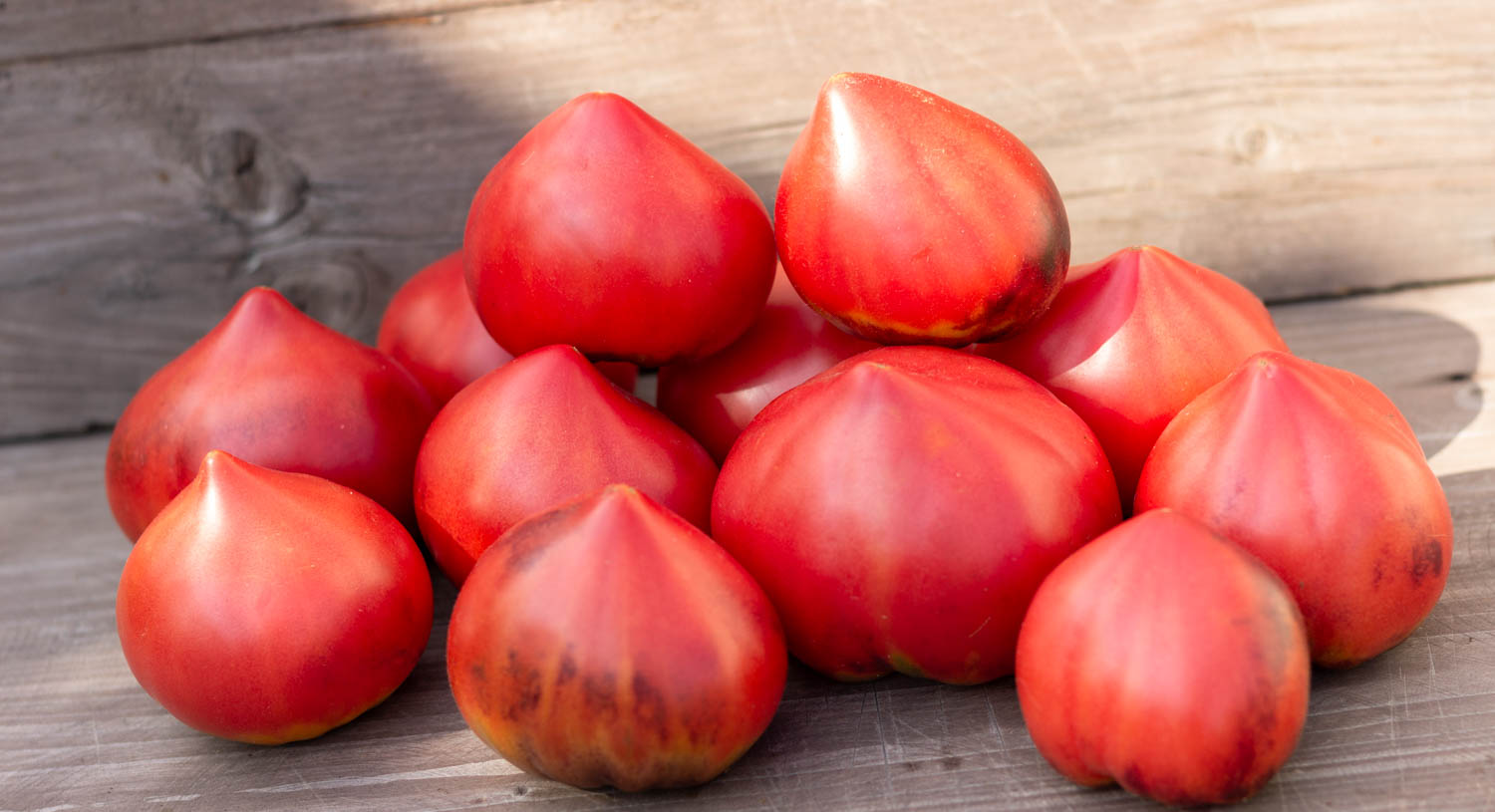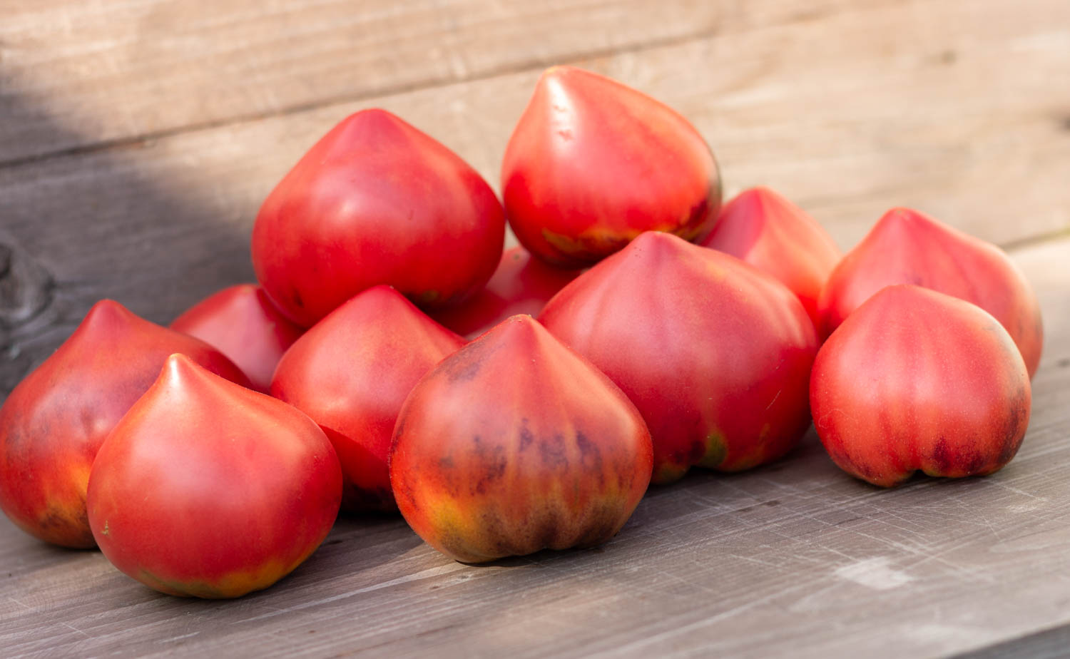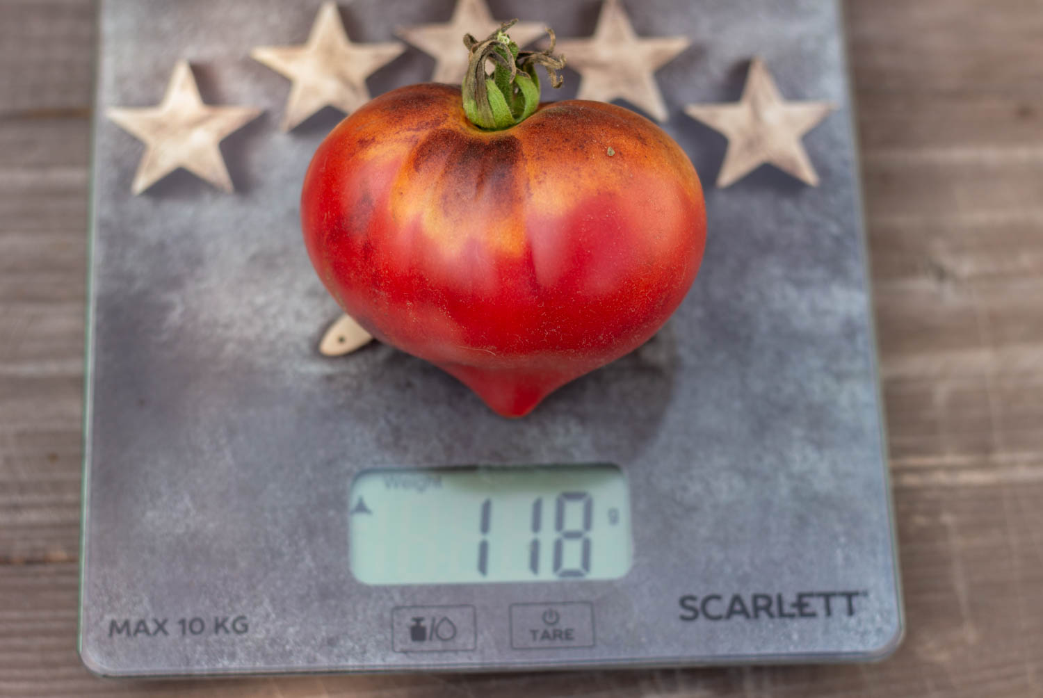 Высокорослый около 1,8 метра, среднеспелый. Плоды изящные сердечки с острым носиком, розово-малинового цвета с легким напылением антоциана, массой 100гр.