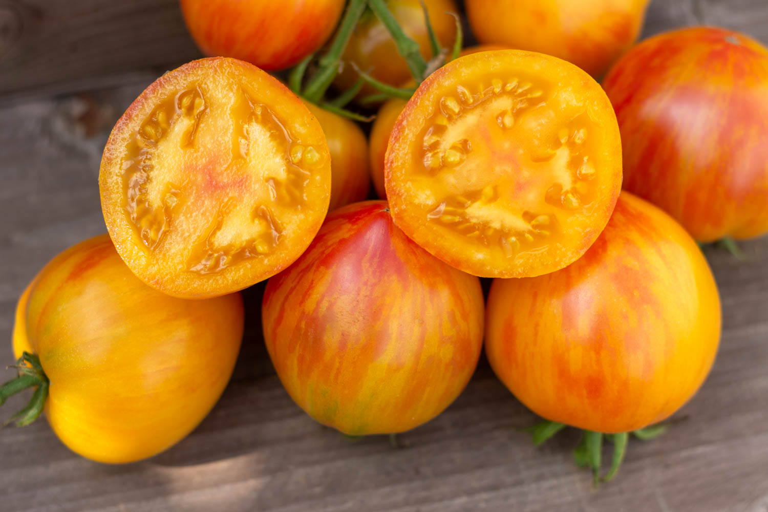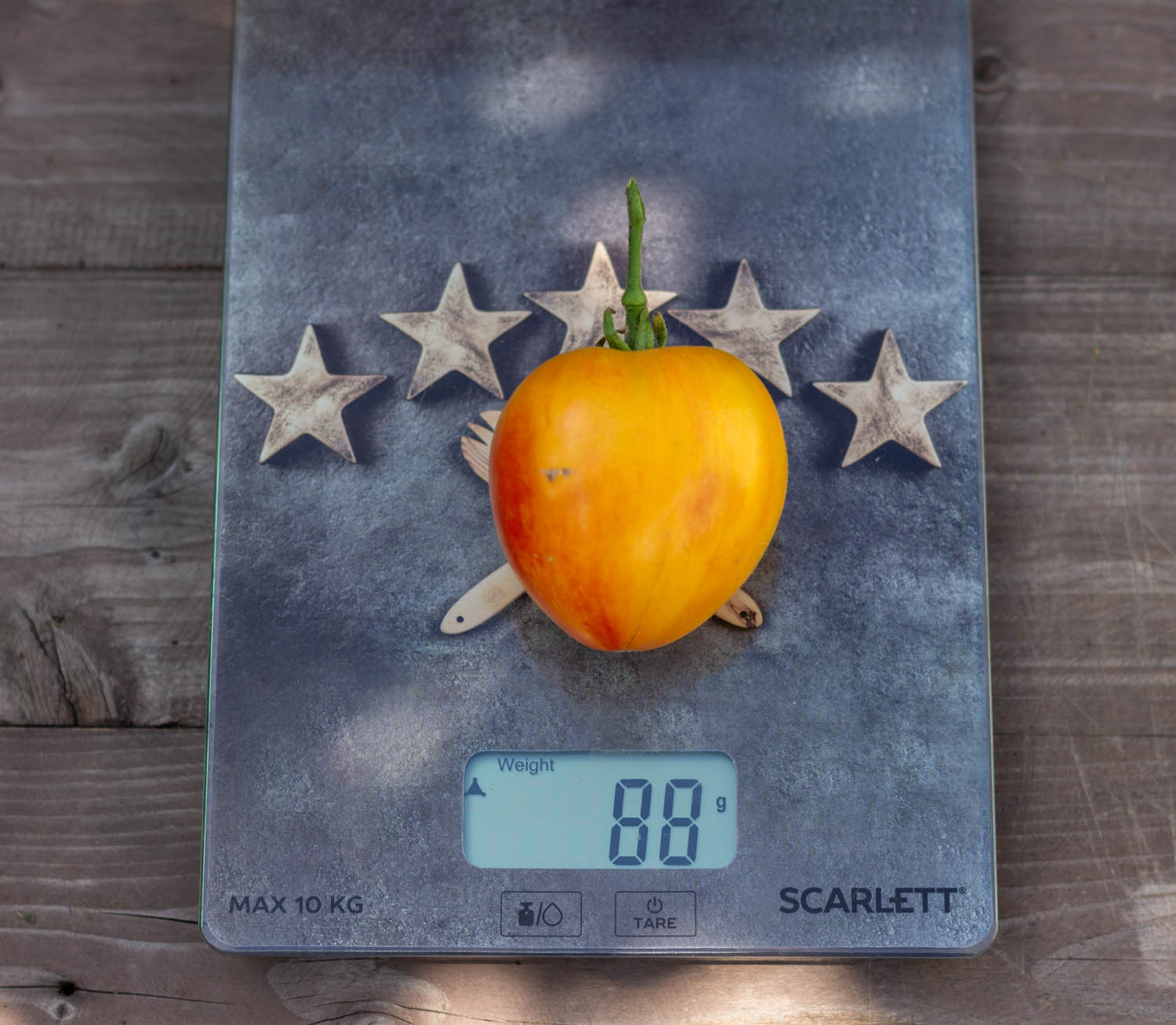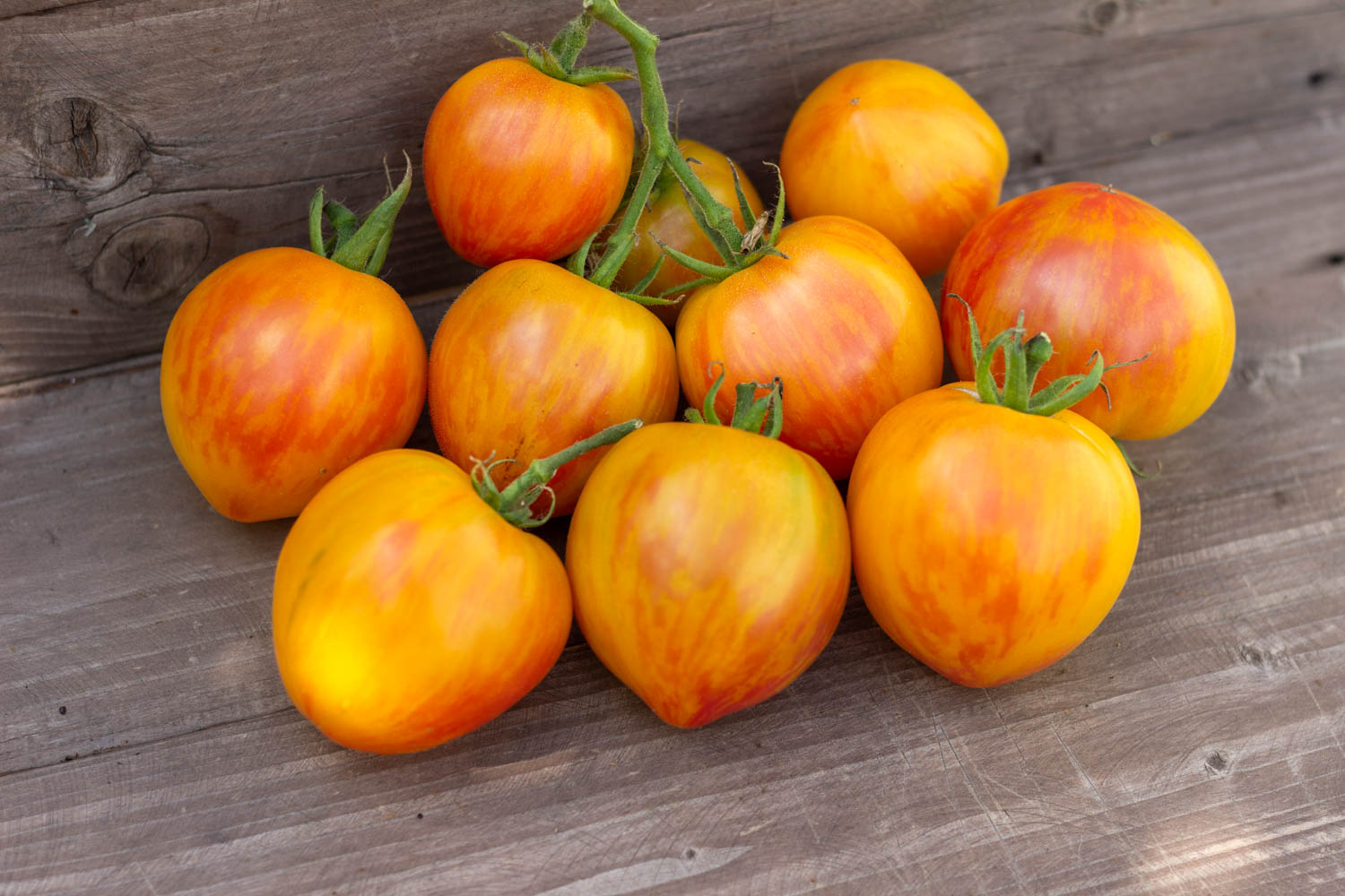 Среднерослый томат до 1,5м, среднеспелый. Плоды небольшие сердечки, желто-оранжевого цвета с малиновыми полосками и разводами, массой 100гр. Плотные, хрустящие — и сладость, и кислинка. Кисти компактные, простые с 5 плодами, завязываемость отличная.