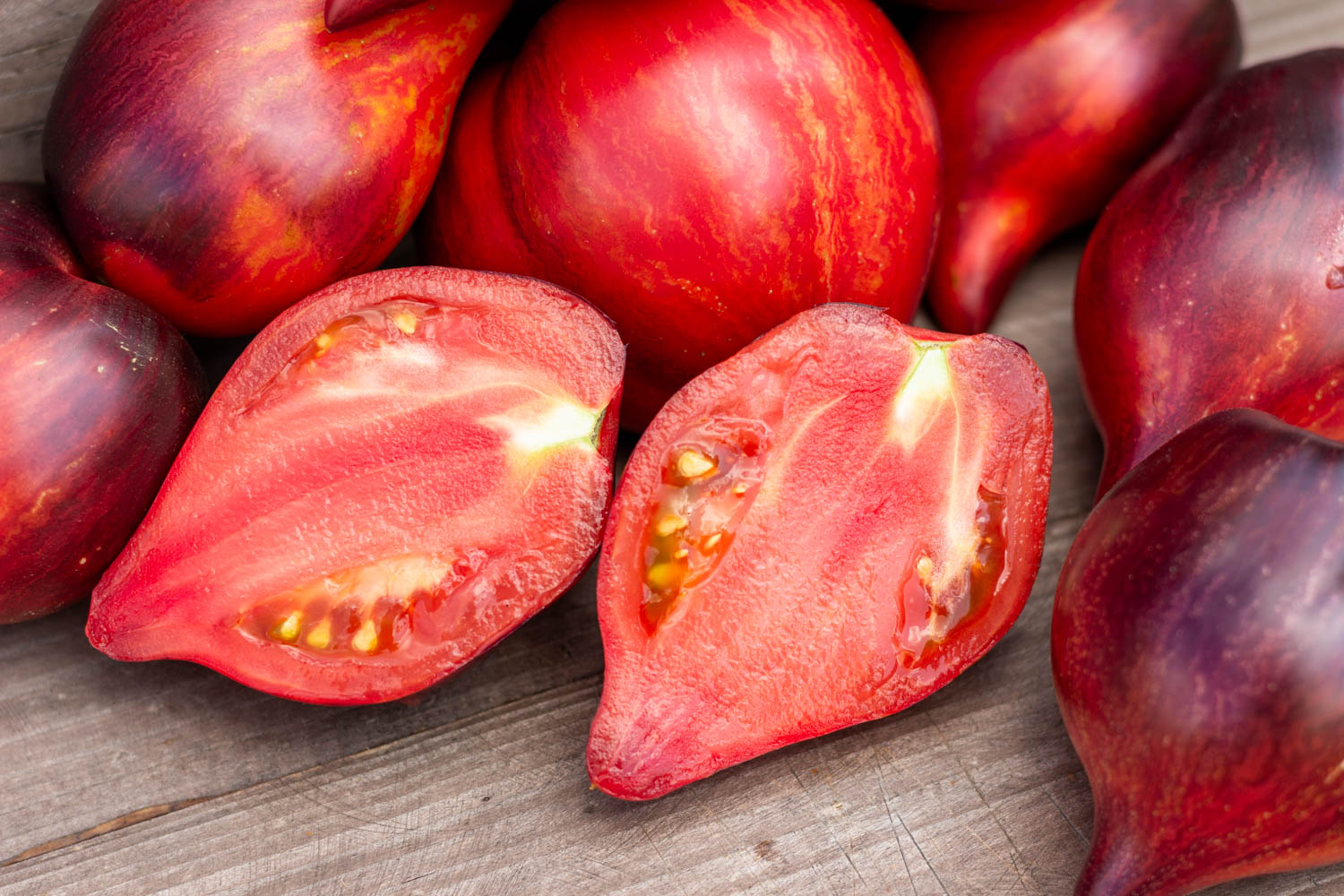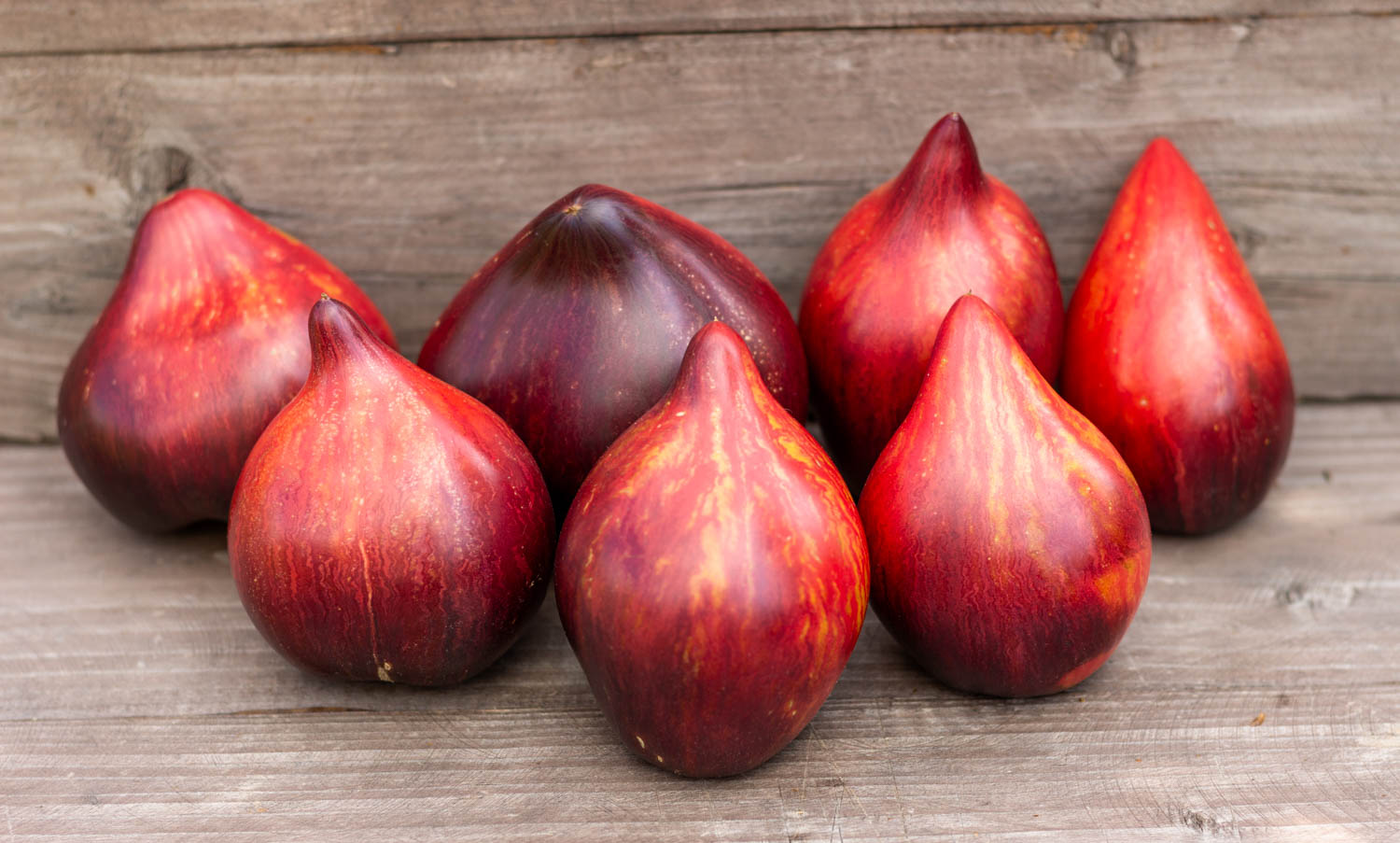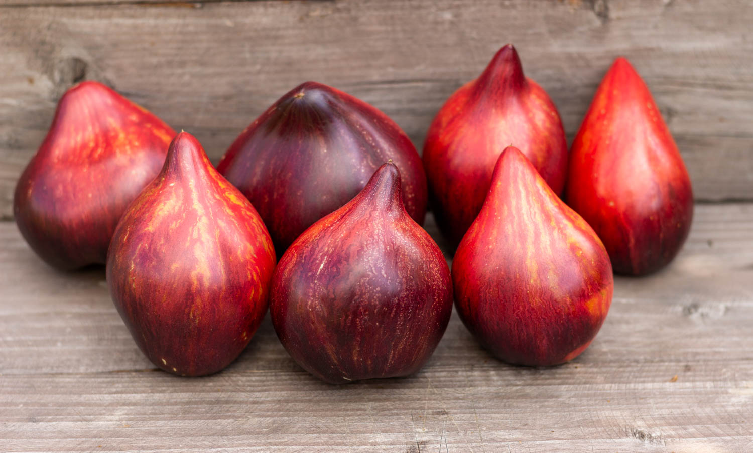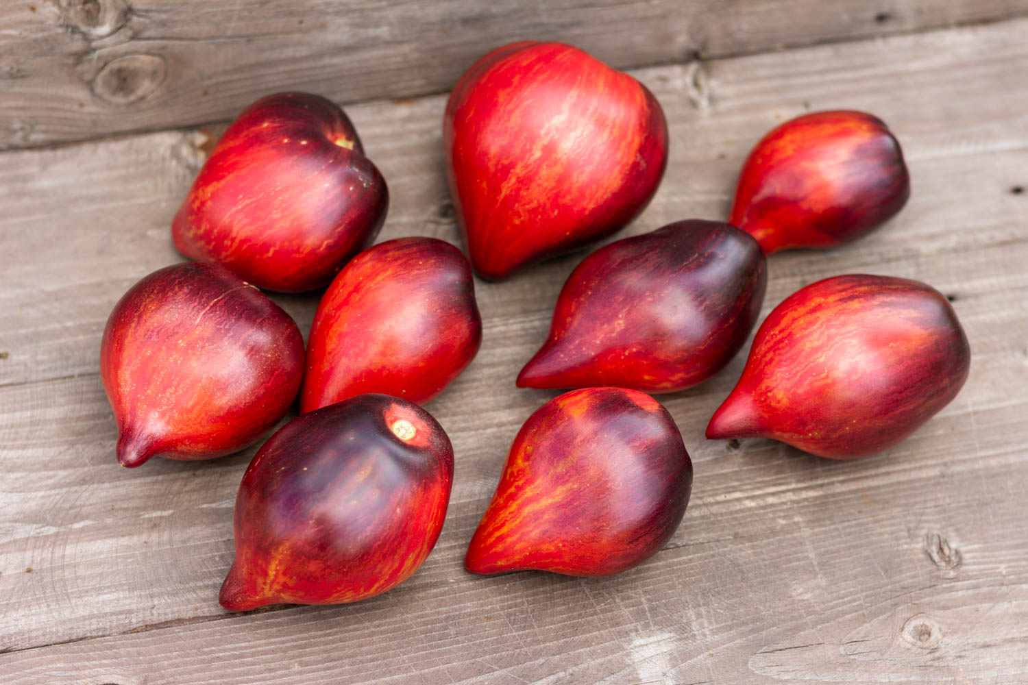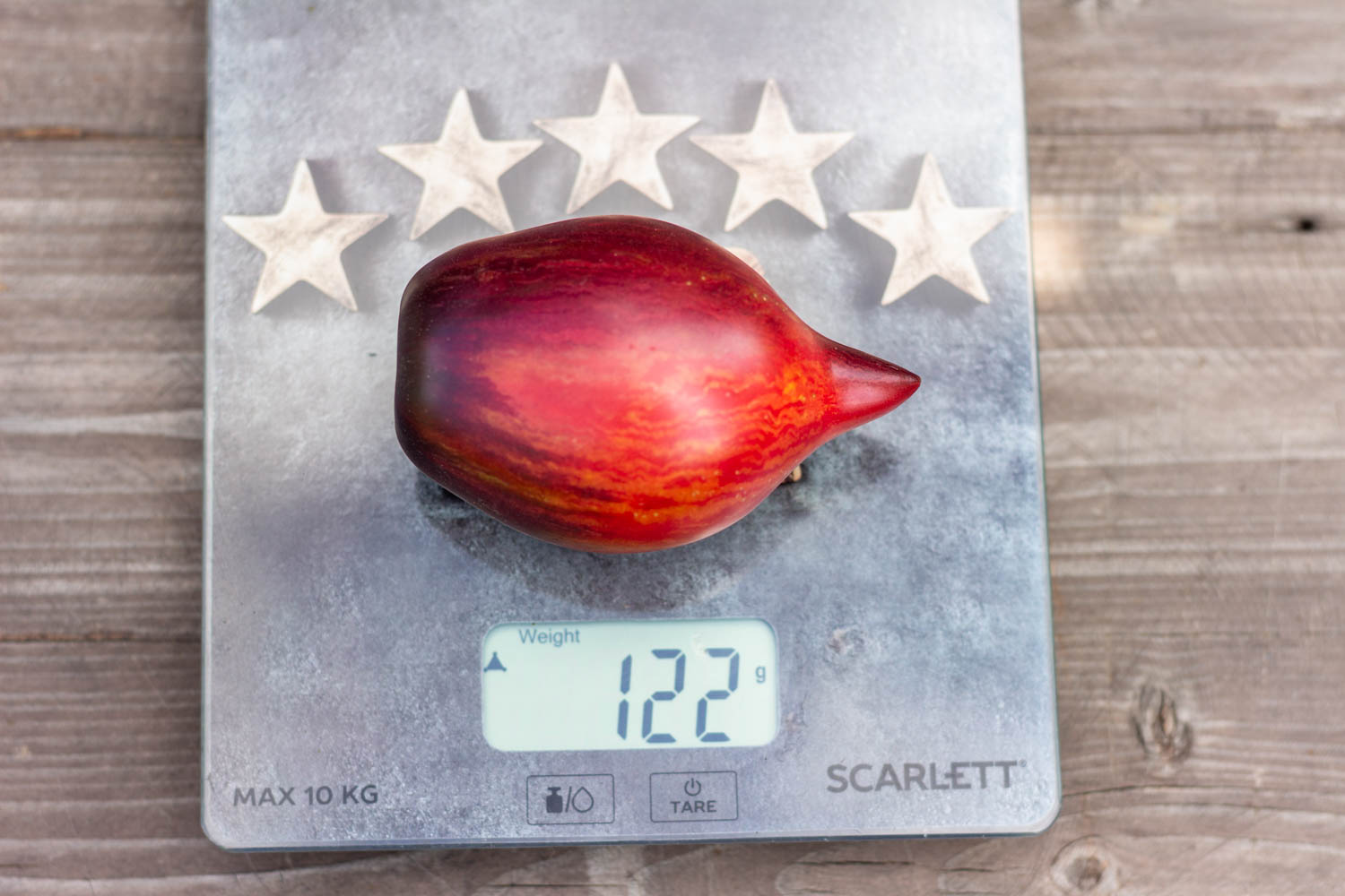 Высокорослый до 1,8 метра, среднеспелый. Плоды сердцевидной формы с длинным острым носом, малинового цвета с золотыми полосками, на плечиках и бочках антоциан, массой 150гр. Ствол и листва тонкого строения. Формировать в 2-3 стебля.