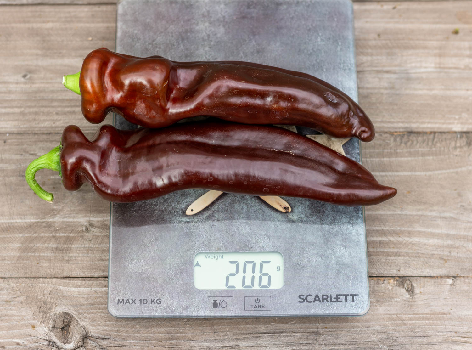 Среднерослый 50-70 см, раннеспелый. Плоды слегка рифленые в форме рога, шоколадного цвета, длиной 25см, массой 100гр. Толщина стенки 4мм. Куст ломкий, полу-раскидистый.
