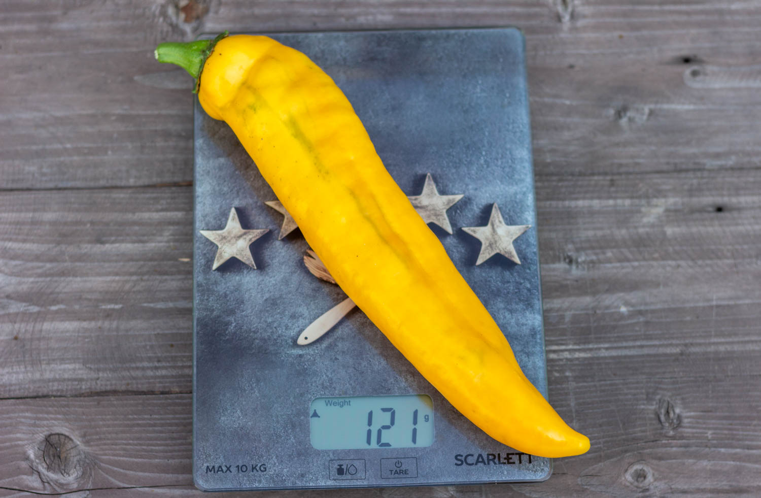 Среднерослый 50-70 см, раннеспелый. Плоды слегка рифленые в форме рога, желтого цвета, длиной 25см, массой 100гр. Толщина стенки 4мм. Куст ломкий, полу-раскидистый.