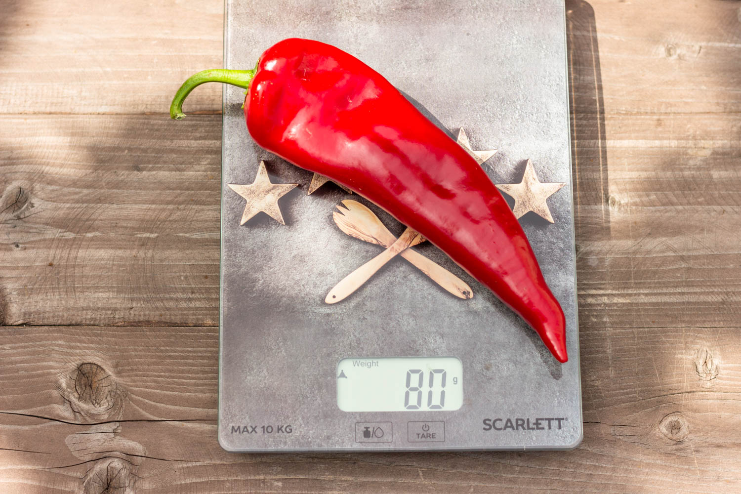 Среднерослый до 70см, среднеспелый. Плоды удлиненно-конусовидные, красного цвета, массой 80гр. Толщина стенки 5м. Сладкие, хрустящие.