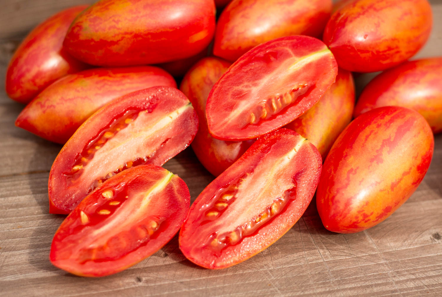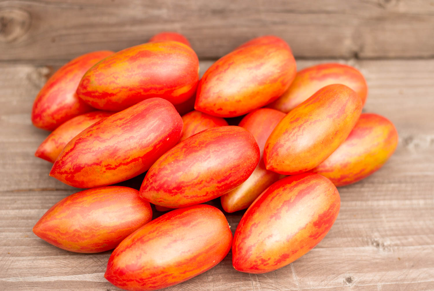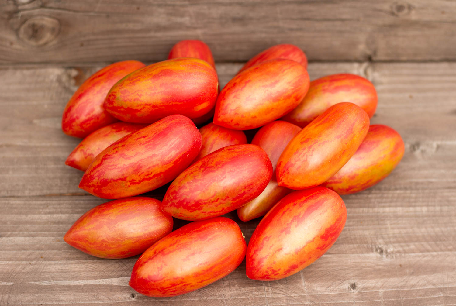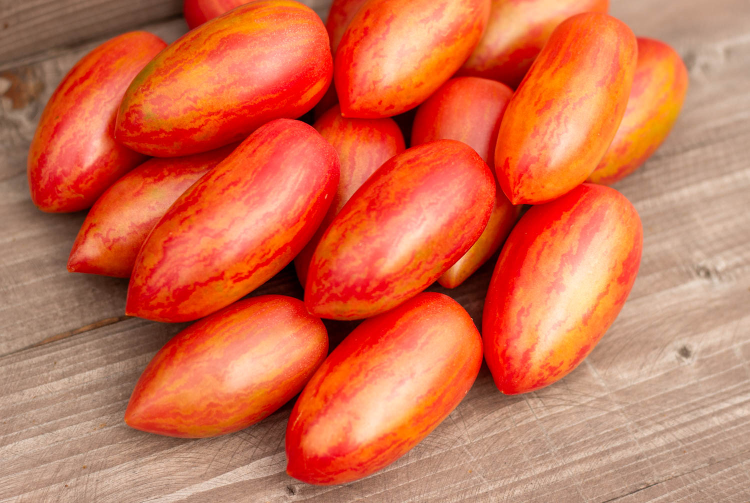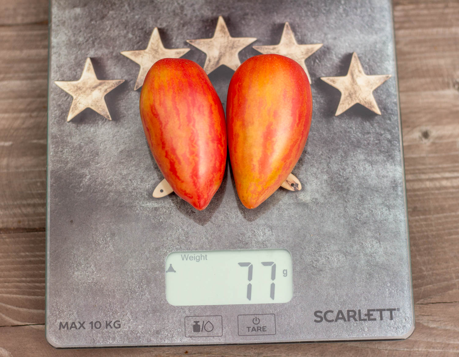 Высокорослый томат 1,8м, раннеспелый. Плоды вытянутые сливки с носиком, малинового цвета с золотистыми полосками и разводами, массой 40-60гр. Хрустящие, сладкие. Кисть простая с 7-10 плодами.