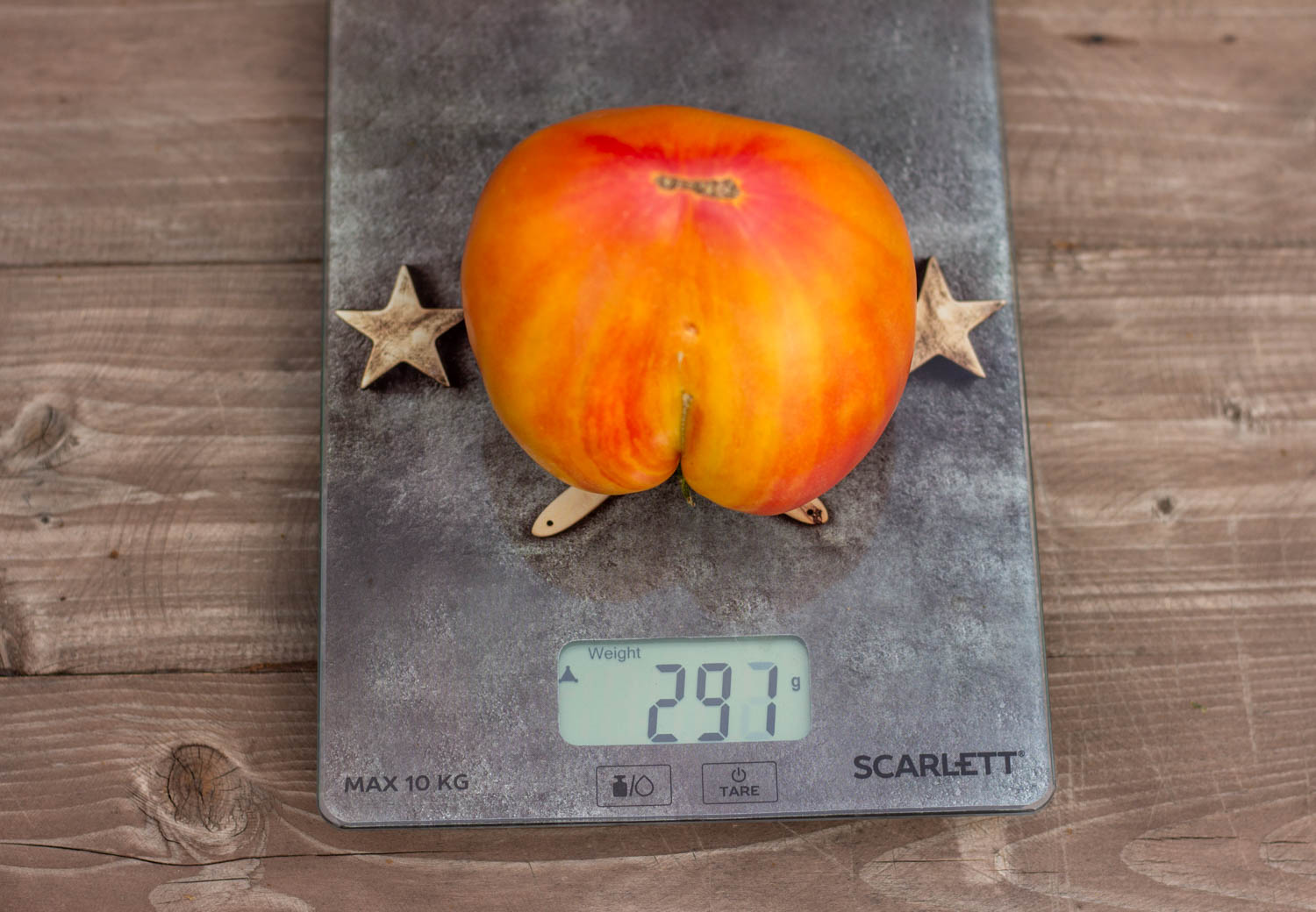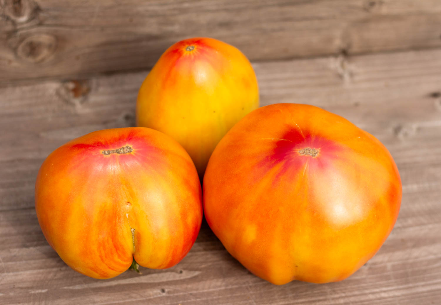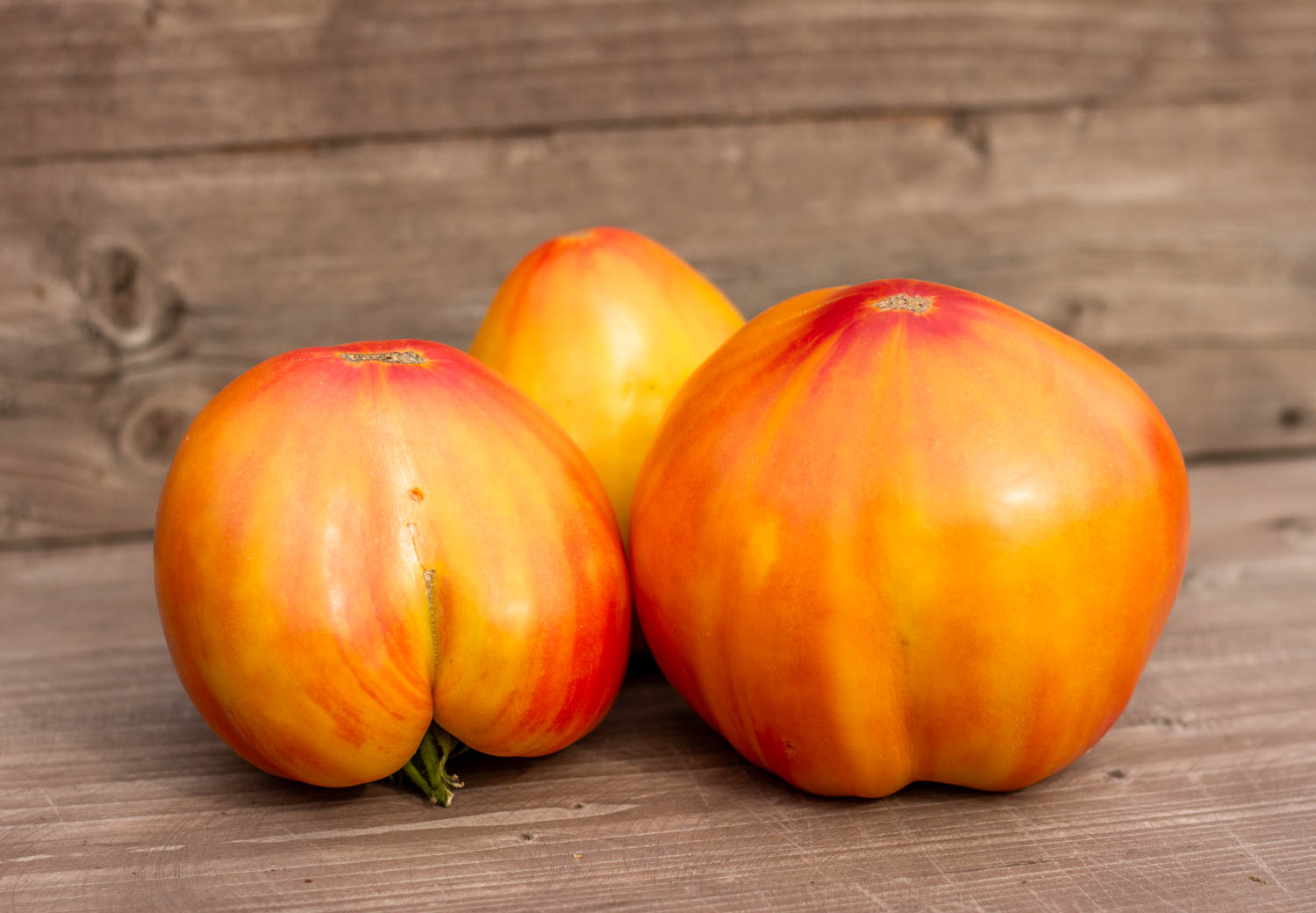 Высокорослый томат до 2 метров, среднеспелый. Плоды ровной сердцевидной формы, би-колоры – на желтом фоне малиновые полосы и разводы, массой 300гр.