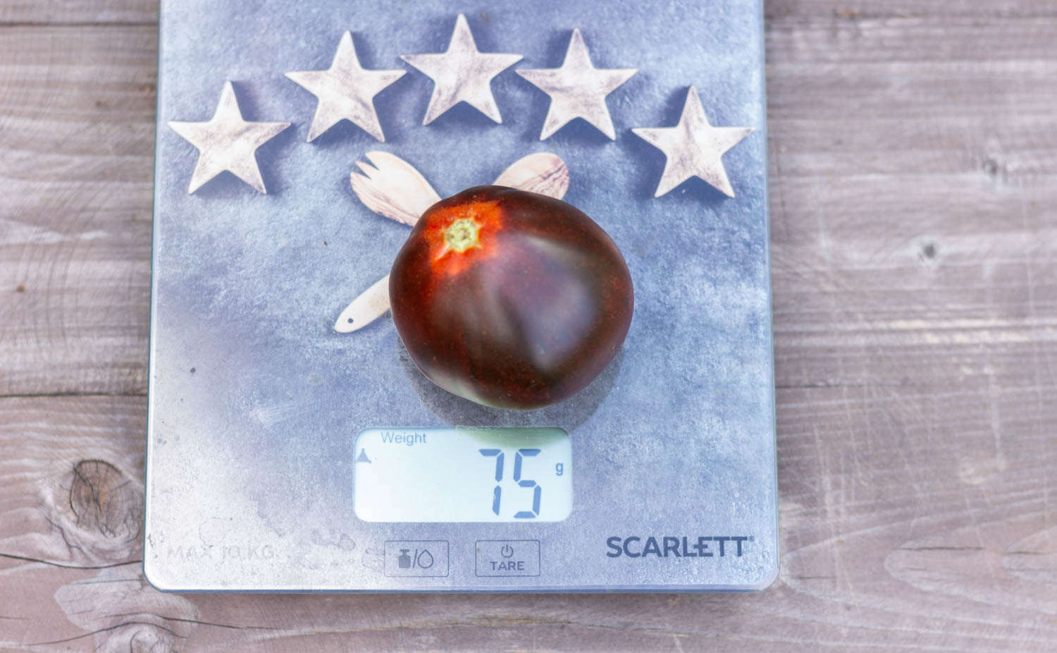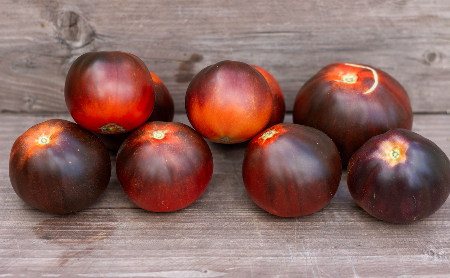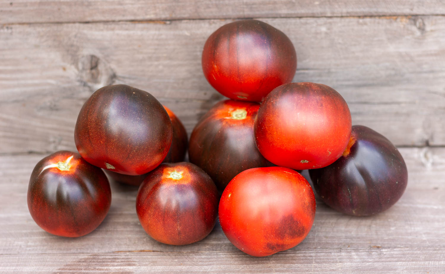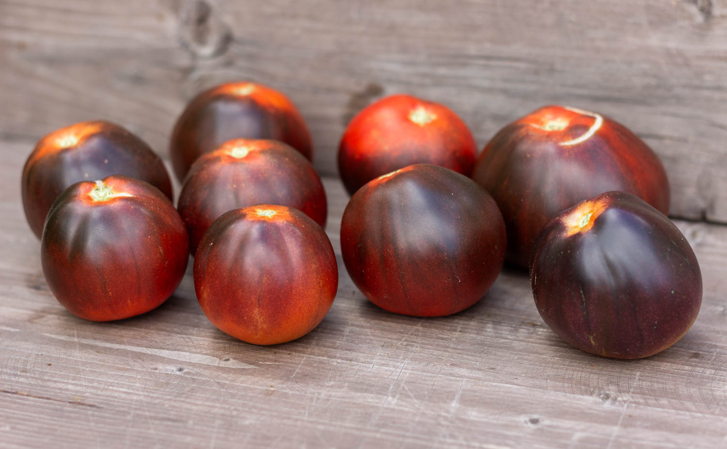 Высокорослый более 2 метров, среднеспелый. Плоды в форме ровного трюфеля, красного цвета, с сильным антоцианом. Кисть простая с 5-7 томатами.