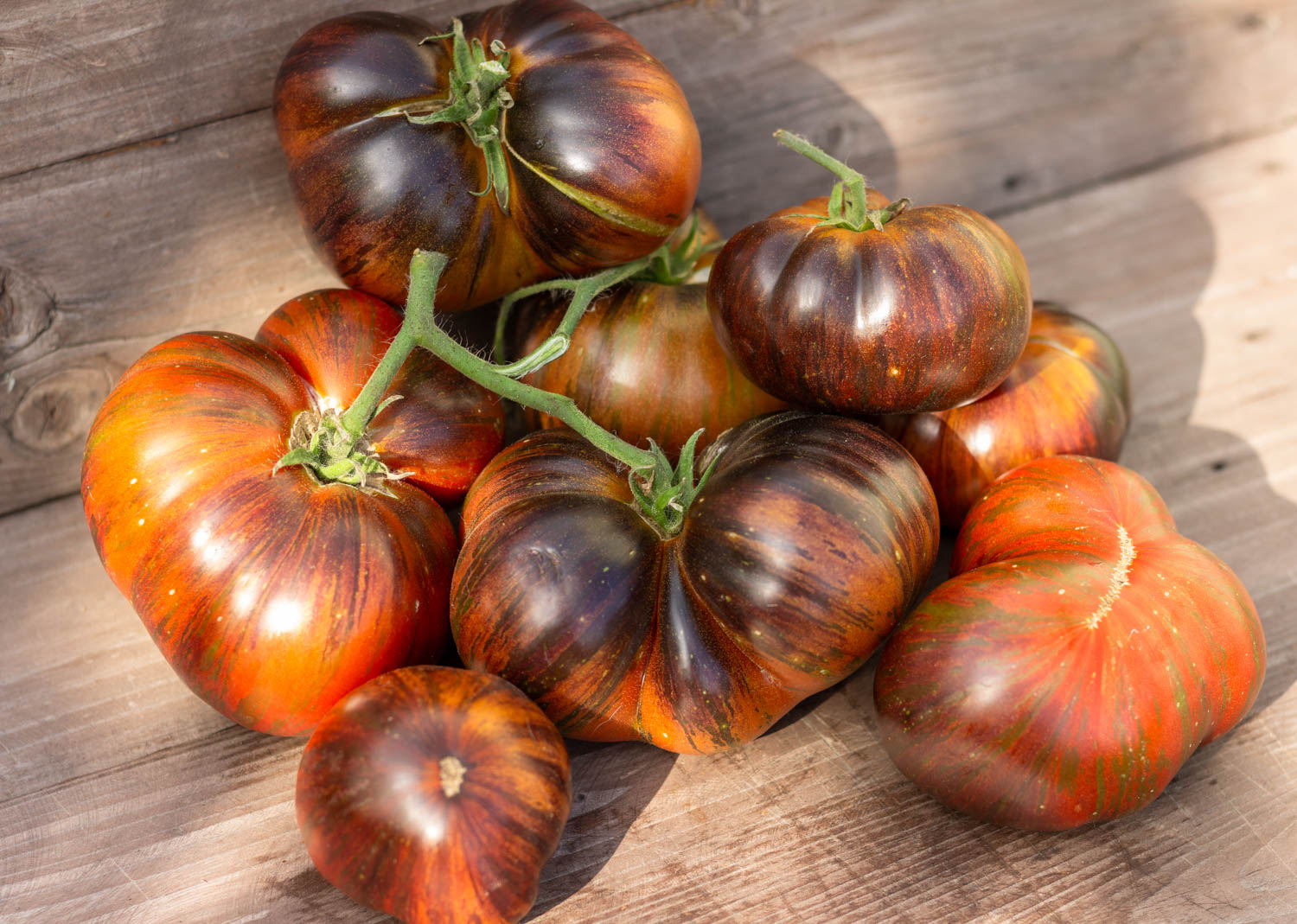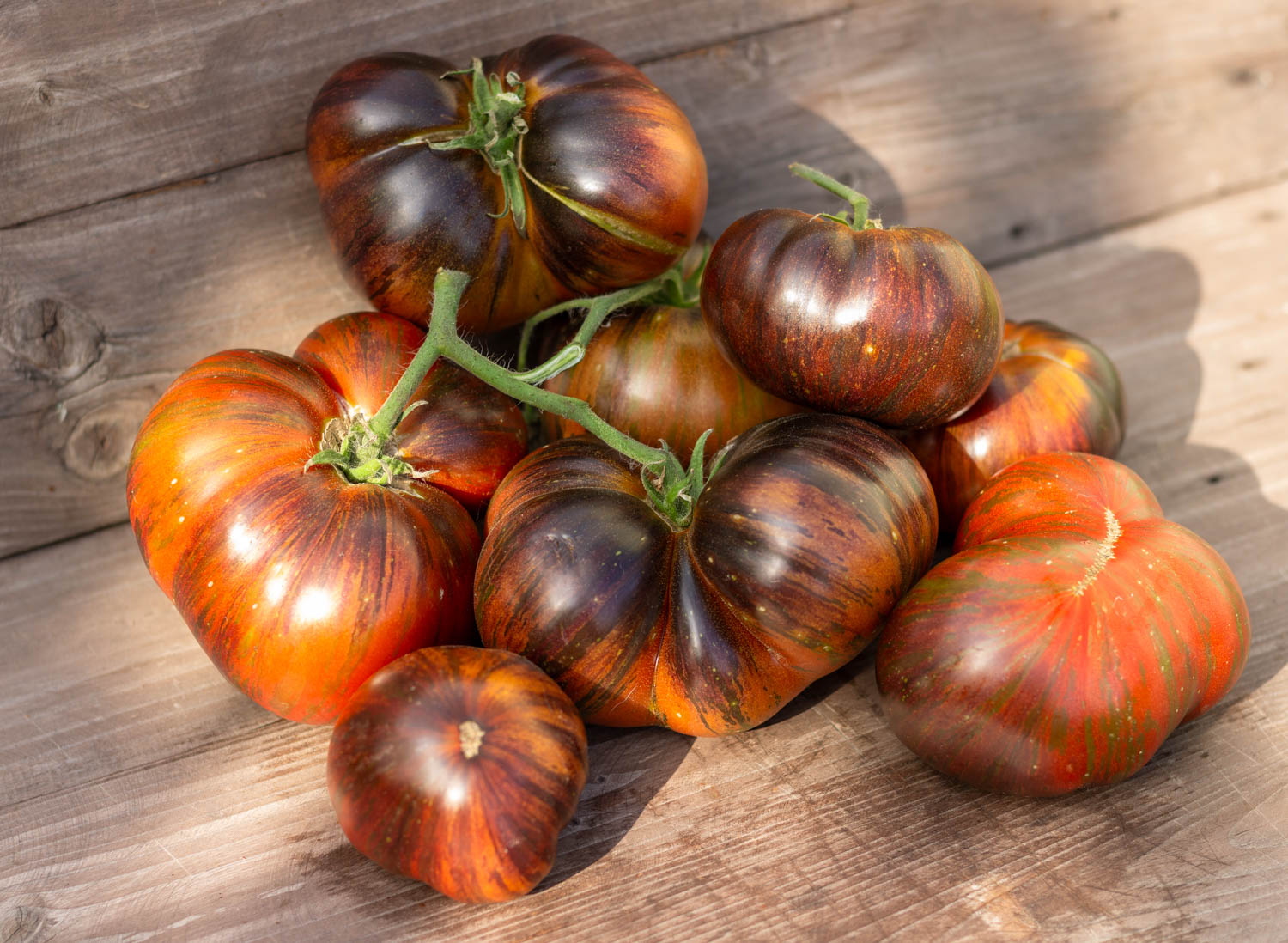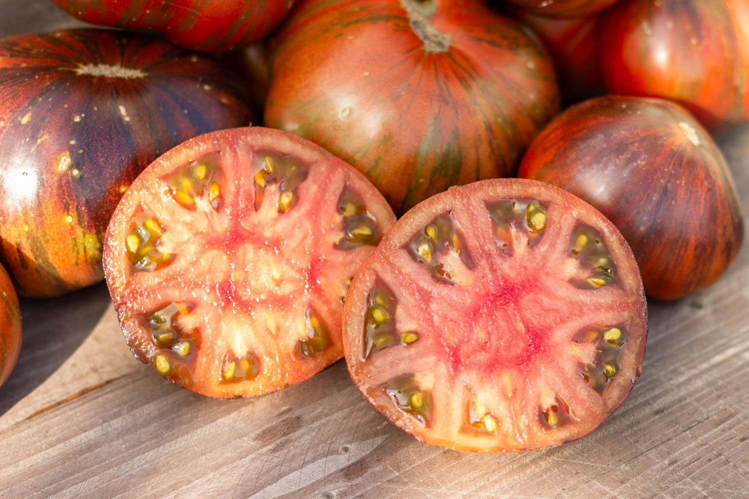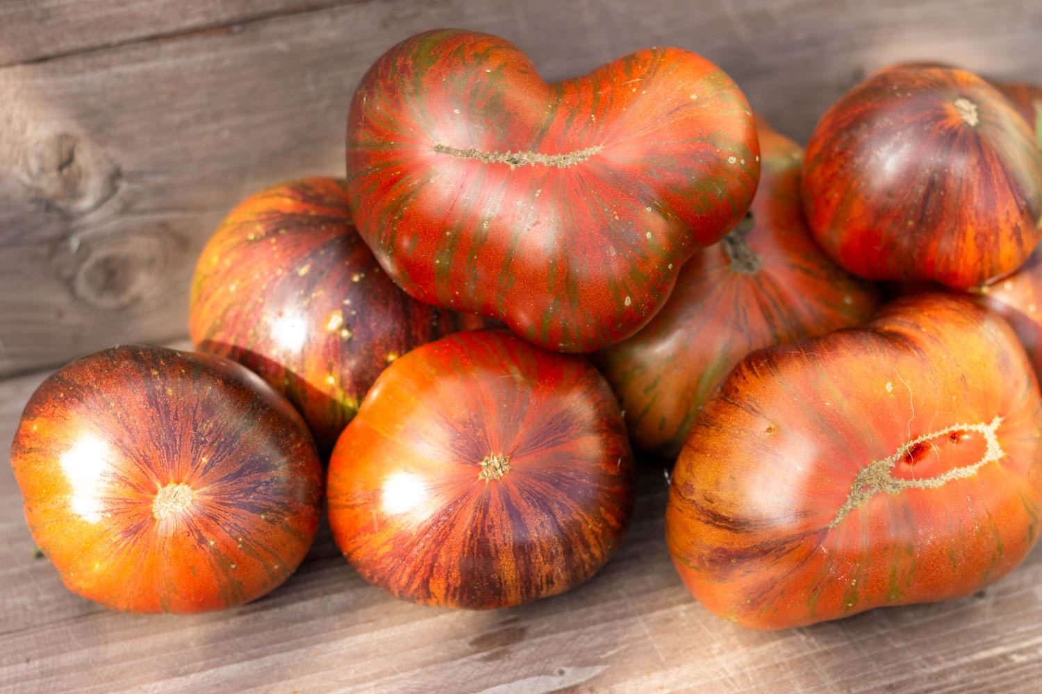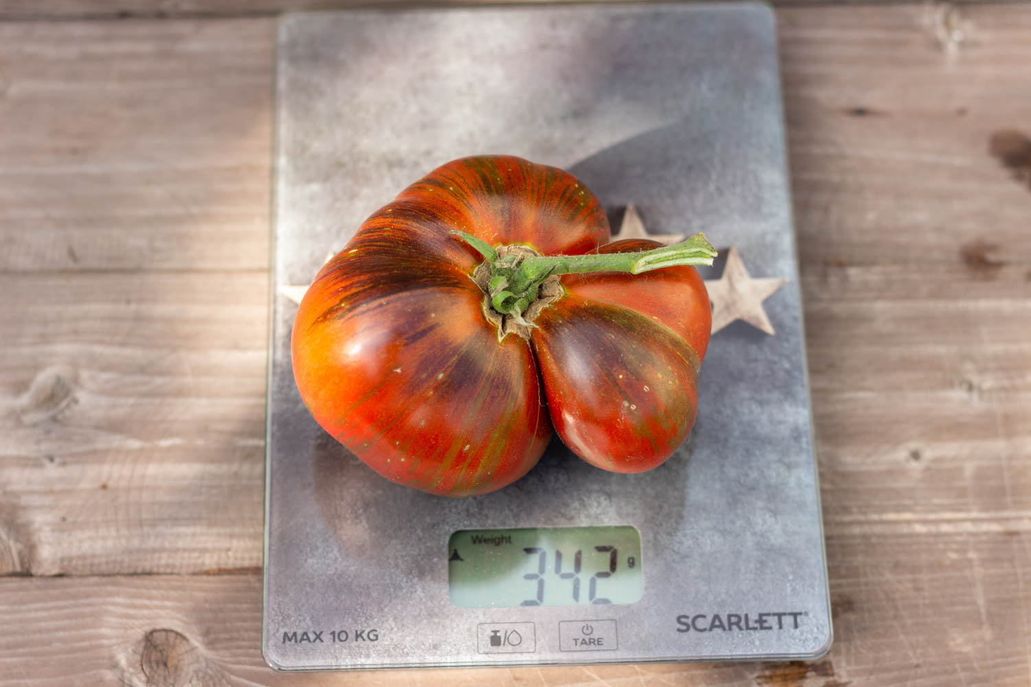 Томатный гном высотой до 1,5 м, среднеспелый. Плоды плоскоокруглой формы с очень пышными плечиками и рёбрышками, би-колоры коричнево-малиновые с зелёными полосками и антоцианом, массой 200-400гр.